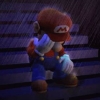 Description: mario is sadly sitting on the stairs in the rain